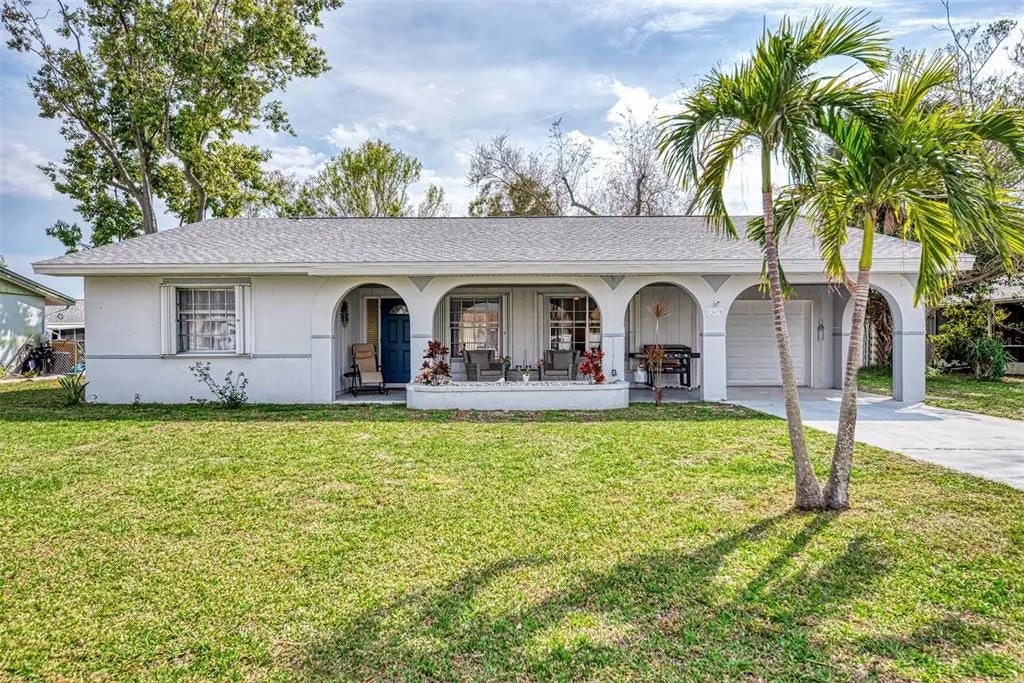 This 2-bedroom, 2-bathroom gem has received fresh paint inside and out, creating a welcoming atmosphere. BRAND NEW ROOF. NEW A/C. Recently installed luxury vinyl waterproof flooring enhances most rooms, while the eat-in kitchen boasts a brand-new stainless steel appliance package, including a dishwasher, side-by-side refrigerator with water and ice dispenser, microwave, self-cleaning smooth-top stove/oven, a new garbage disposal, new cabinets, granite countertops, and recessed lighting. The center island doubles as a breakfast bar, contributing to the kitchen's functionality. A dining room with cathedral ceiling, which can also serve as a family room, opens up to a 10x14 rear patio through sliding glass doors. The spacious 12x24 living room provides an open and inviting ambiance. Upgrades extend to the bathrooms, featuring new vanities, toilets, and tile flooring. The home includes a new garage door opener with 2 remotes, and the hot water heater has been replaced. Most rooms are adorned with new ceiling fans, and hurricane shutters add an extra layer of security. The front of the home features a large 9x38 porch surrounded by newly added palm trees. Situated in the sought-after Gardens of Gulf Cove in Port Charlotte, Florida, near the Englewood border, this residence offers desirable amenities. Schedule your appointment today!