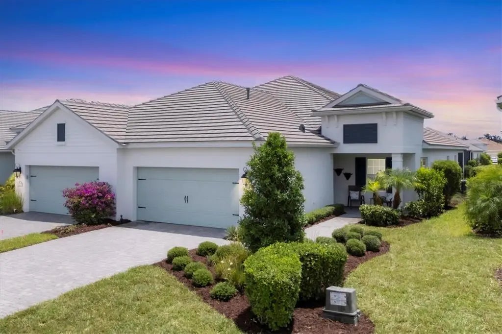 Under contract-accepting backup offers. Feast our eyes on this move-in ready ''Tidewinds'' floorplan with it's beautiful lake view! This stunning villa is built strong and safe with its cinder block construction, concrete tile roof, HURRICANE IMPACT WINDOWS throughout AND is located in the desirable "X'' floodzone. Your new villa boasts 2 bedrooms, 2 full baths, a dedicated den, great room, dining room, kitchen with breakfast bar, indoor laundry room with TWO storage closets and covered extended screened in lanai! Throughout the home you will find 5 1/4" deco baseboards, luxury vinyl plank flooring, multiple trey ceilings and 16-seer rated TRANE HVAC unit AND brand NEW exterior landscaping! The kitchen boasts a nice sized pantry, LED undermount lighting to complement the high level quartz countertops, upgraded herringbone laid porcelain back-splash, 5-burner natural gas range, stainless steel appliances, Island with breakfast bar and LED recessed lighting. The master bedroom includes TWO oversized walk-in closets with custom built-in cabinetry, separate dual vanities and a walk in shower with upgraded tile going up to the ceiling. The great room with its expansive tray ceiling showcases a spacious environment with more than enough room to entertain guests. Open the three paneled HURRICANE IMPACT sliders and you will be captivated by the rear views where you will see some of the most spectacular sunsets over the water. Ditch your propane tank for this extended outdoor lanai comes with a builder grade gas hook up for your favorite grill OR a new kitchenette of your own. Indigo is an active community that features a full time on-site manager as well as a full time activities director that manages an extensive calendar of activities for all ages. A-Rated Gullett Elementary AND Mona Jain Middle School are right outside our gates too! You can also expect sidewalks on both sides of the street, ''Oasis'' pool/spa, resort style heated community pool/spa at the main clubhouse where you will find 5 cabanas with an abundance of seating, 4 pickleball courts, 2 bocce ball courts, 24-hour exercise gym, meeting room/banquet room and playground. Indigo is not only a community that takes care of all ground maintenance to include mowing, fertilizing, irrigation, shrubs and mulch but is right around the corner to a plethora of dining, banking, entertainment, public transportation and MORE!