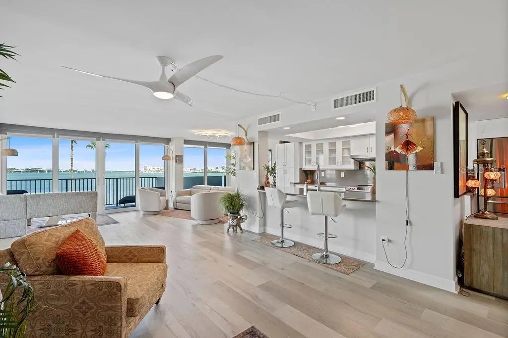 **MILLION-DOLLAR VIEWS AT PRELUDE 80 - **WATERFRONT LIVING** Welcome to Prelude 80, an exclusive and highly desirable condominium community in the heart of Clearwater. This exceptional corner unit features over $120,000 in recent upgrades! Among the enhancements are floor-to-ceiling hurricane-impact windows and doors, a fully renovated kitchen, updated flooring throughout, upgraded lighting and ceiling fans, a new NuvoH2O water softener system, modern faucets, and fresh interior paint. Inside, you're immediately welcomed by an open-concept living and dining area flooded with natural light. The expansive glass windows frame the sweeping views of Clearwater harbor and the intracoastal waters. As a corner unit, the home boasts a large wraparound balcony—an ideal setting for sipping your morning coffee or enjoying the dramatic daily sunsets. The updated kitchen is both functional and refined, featuring solid-surface countertops, stainless steel appliances, a breakfast bar, and sleek, contemporary cabinetry. The home features a desirable split-bedroom floor plan for added privacy. The bright and airy primary suite offers a walk-in closet and a spa-style bathroom designed for relaxation, while the second suite includes its own full bath and walk-in closet—perfect for guests or flexible use. The property includes one assigned covered parking spot (#45) with ample guest parking available on the waterside. An external storage unit (#43) provides added convenience, and shared laundry facilities are located just steps away on the same floor. Life at Prelude 80 means enjoying a true resort lifestyle. Residents have access to a heated waterfront pool with expansive water views, a well-equipped fitness center, a clubhouse with full kitchen, a media room with a library and pool table, BBQ grills, a shaded gazebo and a dedicated bike room. The building offers secured access with a private lobby, and Best of all, all special assessments have already been paid in full—allowing you to move in with confidence and ease. There is also an option for this property to be fully furnished (Turnkey). This premier location is just one block from the Pinellas Trail and within easy walking or biking distance to Clearwater Beach, local restaurants, grocery stores, and downtown attractions. You're also just minutes from Coachman Park and The Sound Amphitheater, a quick drive to the charming town of Dunedin, and only 40 minutes to Tampa International Airport. From daily dolphin sightings to peaceful evenings watching the sun dip below the horizon, this residence delivers a waterfront lifestyle that’s truly unmatched. Schedule your private showing today and experience the luxury and tranquility of life at Prelude 80.
