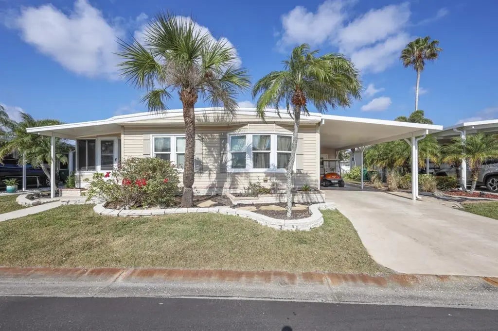 This 1979 two bedroom, two bathroom home may be the perfect winter cottage. Great location, a short distance to pro shop and country club and many of the community amenities. Primary bedroom suite with private en-suite bath features a walk-in shower. Guest bath with tub/shower combination. Guest bedroom has a fold down Murphy style bed, perfect when your second bedroom doubles as a home office or den. Spacious 120sq ft side lanai, large 96sq foot storage shed with washer/dryer. Carport replaced in 2024. AC replaced in 2011. Home being sold furnished with a non-warranted golf cart. **Be sure to check out the 3-D virtual tour and walk through video links** Located in award winning Maple Leaf Golf & Country Club, a popular 55+ gated golf course community with an active resort lifestyle. Features a Par 62, 18 hole golf course, 5 tennis courts, bocce ball, lawn bowling, 2 shuffleboard courts, 4 heated swimming pools, 2 hot tubs, fitness facility, woodworking facility, 75+ clubs/activities, 4 pickleball courts, restaurant with full service bar, tiki hut/bar and more. Don't miss out on this opportunity to live in a thriving community where every day feels like a vacation. It's true what they say, it's all about the lifestyle.