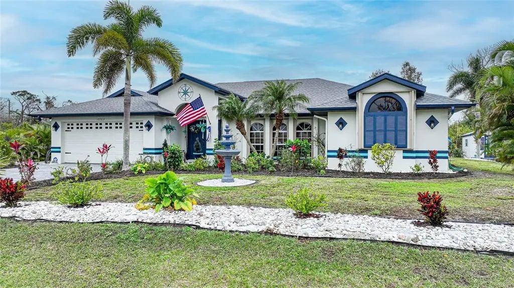 REDUCED PRICE!!! Welcome home to your beautiful COASTAL OASIS situated in the highly desirable community of Gulf Cove, a BOATING community with GULF ACCESS and NO DEED RESTRICTIONS! This picturesque home is positioned on a HIGH ELEVATION CORNER surrounded by palm trees and expansive landscaping framing the PRIVATE DOUBLE LOT! An OPTIONAL HOA of $65/yr for use of community boat ramp, park and picnic pavillion! The front grand entrance with DOUBLE DOORS opens into a lovely foyer with VAULTED CEILINGS throughout, an ACCENT WALL in the spacious great room with a built-in electric fireplace, expansive front windows that allow for natural light to illuminate the home and a STUNNING VIEW through the adjacent triple sliding glass doors to the scenic PRIVATE BACKYARD and POOL AREA! The entertaining focal point is the large 14x28 SPARKLING HEATED POOL enclosed in the covered screened lanai area, perfect for relaxing after a long day or entertaining with friends! The primary bedroom is spacious and features a tray ceiling, PRIVATE PATIO DOOR access to the pool, two walk-in closets and an en-suite bathroom with a connecting pocket door. This retreat provides a full-size linen closet, dual sink vanity, corner tiled shower and an oversized garden tub in addition to a private water closet. The two guest bedrooms in the south wing of the home both include spacious walk-in closets with the rear bedroom offering a private patio door for pool access. The second bathroom located between both bedrooms features an updated vanity, closet storage and a full-size tiled tub/shower combo as well as pool access. Step into the MODERN KITCHEN boasting stainless steel appliances (refrigerator is new), newer deep sink, and newer dishwasher and microwave. The solid surface countertops and tile floors along with a convenient pantry and loads of storage offer versatility and ease of access for all your culinary needs. You can enjoy your pool view from just about anywhere, while preparing your meals, sitting at either the attached breakfast bar or adjacent dinette area!! The oversized dining room overlooking the outside palm trees could also be used as a separate living space, great room, billiard room, office or craft area! The laundry room is just steps away from the 2-car garage and is equipped with a utility sink and a front loading washer/dryer set...complete with a folding station on top!! This IMMACULATELY KEPT property is MOVE-IN READY with furnishings and hot tub negotiable with an acceptable contract! Numerous upgrades include a new roof in 2021, professionally painted neutral and coastal colors both inside and out in 2021, upgraded pool pump 2024, new flooring/drywall in the oversized shed, newer AC serviced every 6 months and updated lighting and ceiling fans as well! With a high and dry elevation, this home provides secure peace of mind with HURRICANE SHUTTERS on all windows and lanai and ZERO FLOOD CLAIMS or water intrusion during recent storms! This perfect location offers prime versatility with quick access to our PRISTINE GULF BEACHES, shopping, dining, Farmer's Markets and more! Ample fishing, boating, kayaking and golfing opportunities are within easy reach along with state parks, walking trails and bicycling trails close by! Sarasota and Ft Myers are an easy drive if you desire a dose of city life along with regional and local airports!