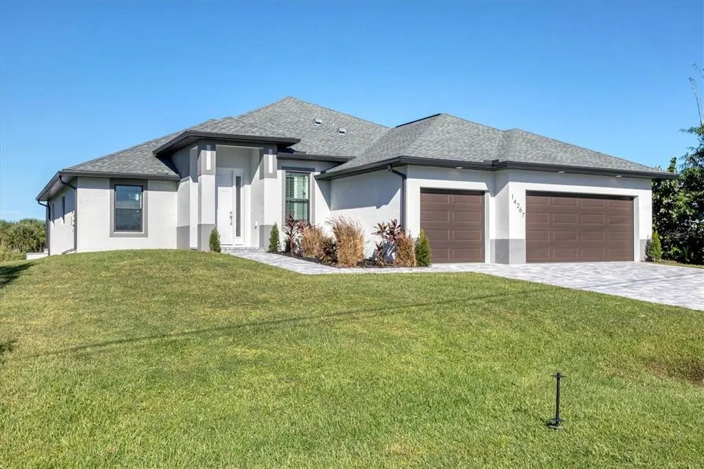 One or more photo(s) has been virtually staged. Brand-New Spectacular Waterfront Home with Sailboat Access! This stunning 3-bedroom, 2.5-bath home with a den (or optional 4th bedroom/nursery) delivers the ultimate Florida lifestyle with no-bridge access to Interceptor Lagoon, the Myakka River, and the Gulf of Mexico. The open great room design features tray ceilings in the living, dining, and primary suite, recessed lighting inside and out, 24x48” porcelain tile, impact-rated low-E windows and doors, and plantation shutters. The chef’s kitchen is a showpiece with a waterfall island with seating, granite counters, farmhouse sink, slow-close drawers and doors, glass mosaic backsplash, and above/below cabinet lighting. The primary suite includes dual walk-in closets, a spa-inspired bath with dual sinks, walk-in shower with shampoo shelf, while the secondary bath features a relaxing tub. Bedrooms 2 and 3 also have custom walk-in closets. Outdoor living is exceptional with a caged pool and smart spa, paver-wrapped deck, 30x12 covered lanai with dual fans and lights, outdoor shower, half pool bath, and a security fence around the screen enclosure. A triple-wide paver driveway leads to a 3-car garage with epoxy flooring. Additional highlights include Swiss Madison toilets, French doors with inset blinds, large ceiling fans, and a convenient laundry storage area. Dock is place, ready for your boat! Move-in ready and packed with luxury upgrades, this brand-new home is a boater’s paradise—schedule your private showing today!