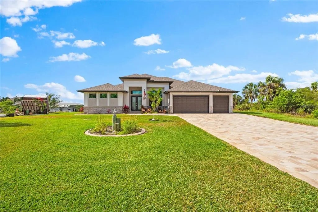 Welcome to your dream waterfront retreat in the boating community of South Gulf Cove. Situated on an oversized corner lot in an X-FLOOD ZONE, this stunning custom-built DM Dean home offers the perfect balance of elegance, comfort, and Florida lifestyle. The exterior impresses immediately with a rip-rap seawall capped in concrete, a 10x40 dock with a 10,000 lb boat lift, and a 10x10 floating kayak dock with ramp, making water access effortless. The lush St. Augustine lawn is irrigated directly from the canal, and the professionally landscaped yard is accented by an oversized paver driveway and an 8x12 storage shed for added convenience. Enjoy ultimate outdoor living with a heated saltwater pool and spa featuring a sun shelf, bench seating with jets, and decorative deck fountains—all enclosed beneath a 49-foot-wide clear view screen. The expansive 39x13 covered lanai is a true entertainer’s dream, complete with a full outdoor kitchen including a Blaze stainless steel grill, wine fridge, vent hood, and piped-in propane. A whole-house Kohler generator with 500-gallon in-ground propane ensures peace of mind, while four security cameras and a Ring-monitored system provide extra security. Step inside to discover luxury finishes throughout, including sealed travertine tile flooring, 8-foot doors, updated square trim, plantation shutters, and soaring 12- to 16-foot ceilings. The great room stuns with an enhanced coffered ceiling and 90-degree, 10-foot sliders that fully open to the lanai, seamlessly blending indoor and outdoor living. Foam insulation, a tankless water heater, Kevlar storm screen, and upgraded electrical throughout the home highlight the thoughtful attention to efficiency and comfort. A screened garage door, oversized 3-car garage, and 3-zone HVAC system add further practicality. The chef’s kitchen is both beautiful and functional, boasting solid wood custom cabinetry with soft-close features, level 7 granite countertops, GE Profile stainless appliances with induction stove, a farmhouse sink, custom glass front display cabinets, built-in spice and oil racks, and two pantries for optimal storage. Retreat to the luxurious primary suite, where you'll find a custom walk-in closet and a spa-like bathroom complete with a soaking tub, rain shower, and bidet. Guests will enjoy spacious bedrooms and a large linen closet, providing both comfort and privacy. Bonus features include multiple flat-screen TVs—85", two 65", and two 55"—along with a sound bar and subwoofer, all included with the home. This exquisite residence offers the rare combination of high-end design, thoughtful upgrades, and direct waterfront access in one of the area's most desirable neighborhoods. Don’t miss the opportunity to own this truly exceptional home.