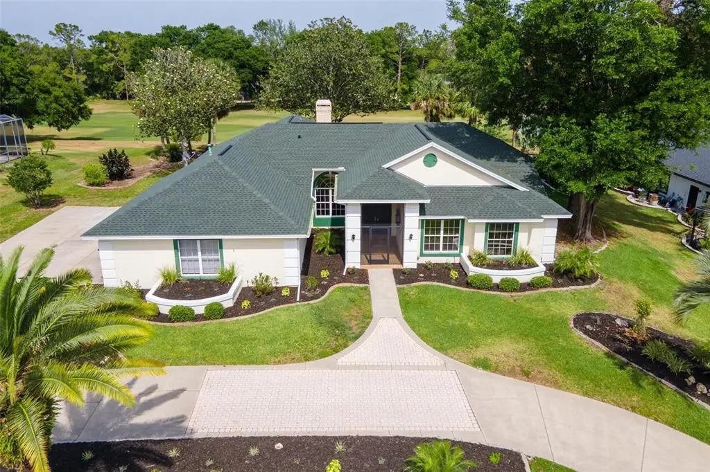 ROOM FOR EVERYBODY" GOLF FRONTAGE POOL HOME! Enjoy "Resort Style Living" feeling safe and secure 24/7 in this guard gated, sought after, all age Golf Community where luxury meets tranquility! Minutes from the Villages, residents have convenient access to world-class shopping, dining, and entertainment. This custom, newly remodeled home blends timeless elegance with Florida charm. Set on a beautifully elevated half-acre lot overlooking the 15th tee of the golf course, it offers a rare combination of privacy, space, and scenic views. Pull into the extended circular driveway to the side-entry THREE CAR GARAGE that offers impressive curb appeal and ample parking—ideal for hosting guests. Step inside to soaring volume ceilings and a graceful layout designed for both relaxed living and grand entertaining. The formal living room features expansive triple glass sliding doors that recess leading to lanai and screened pool with spa area, seamlessly blending indoor and outdoor living. A formal dining room is perfect for family gatherings and holiday celebrations, while the adjacent home office—with custom built-ins and desk space—offers a quiet retreat for work or study. At the heart of the home, the fully renovated kitchen boasts quartz countertops, stainless steel appliances, abundant cabinetry, and a spacious breakfast bar. The adjoining family room invites cozy evenings with its gas fireplace, built-in wet bar, and casual comfort—an ideal space for entertaining or unwinding. Designed with versatility in mind, the home’s split floor plan includes a private secondary suite with en-suite bath and pool access—ideal for guests or multi-generational living. Two additional guest rooms are tucked away in a private wing, accessible via a pocket door and wide hallway, complete with a shared full bath. This thoughtfully designed residence wraps around the screened lanai in an “L” shape, providing pool views and access from nearly every room via four sets of sliding doors—flooding the interior with natural light and creating an effortless indoor-outdoor flow. Additional highlights include NEW ROOF 2021!! Don’t miss your opportunity to own this serene slice of luxury living!