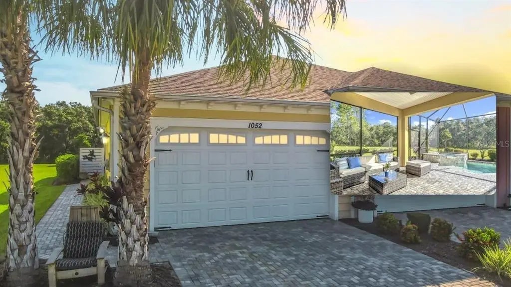 Under contract-accepting backup offers. Welcome to paradise in this sought-after Key West-style Antigua Model Villa in the gated 55+ community of Latitude Margaritaville. Enjoy your own private heated pool and spa, extended screened lanai, and a private wooded backyard. Inside, you'll find engineered wood and tile flooring, crown molding, hurricane-impact windows, plantation shutters, and custom closets. The upgraded kitchen features 42'' cabinets, granite countertops, full backsplash, a large island, and upgraded appliances with a gas range. **ICON Golf Cart Included** Live the resort lifestyle every day with access to a lagoon-style pool, pickleball, tennis, bocce, basketball, walking trails, golf cart paths, and a state-of-the-art fitness center with sauna, indoor lap pool, and massage rooms. Dine at the Latitude Bar & Chill or socialize at the on-site restaurant. This is your chance to enjoy laid-back luxury and vibrant community living—move in and start living the good life now! Chandelier in dining room excluded from sale Private Remarks: Chandelier in dining room excluded from sale