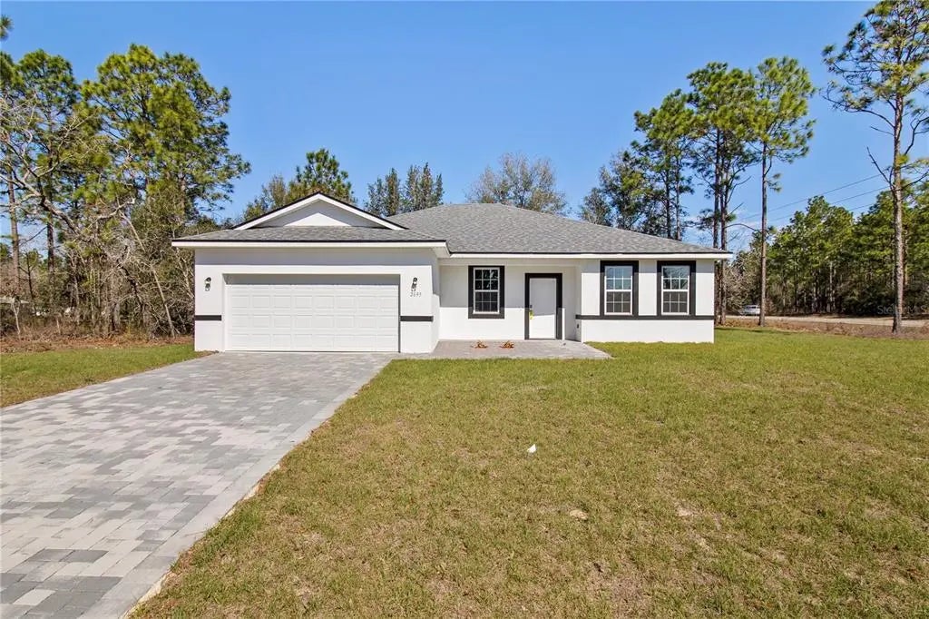 Exciting Corner Lot New Construction in Citrus Springs! This move-in ready contemporary home offers the perfect blend of modern design and practical living, featuring four spacious bedrooms and three beautifully appointed bathrooms. Step inside to find tile flooring throughout, exuding a sleek and elegant ambiance. Each bathroom is meticulously crafted with luxurious finishes, adding a touch of sophistication to your daily routine. The outdoor space is equally impressive, with a covered lanai, a generous yard and an exclusive paved driveway, excellent option for entertaining or basking in the glorious Florida sunshine. Perfectly situated near schools, parks, and all essential amenities, this property promises a lifestyle of convenience and accessibility. Don’t miss your chance to be the proud owner of this gem in Citrus Springs! CLOSING COST ASSISTANCE OFFERED UP TO 2% WHEN USING PREFERRED LENDER.