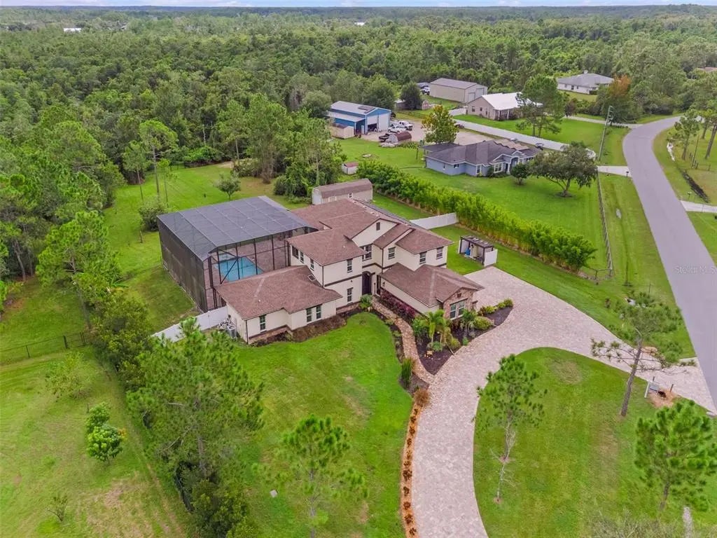 Outdoor living is highlighted by a custom heated saltwater pool and spa under an expansive screen enclosure, framed by stone pavers and lush landscaping. Additional amenities include a detached garage/workshop with water and power, a dedicated RV pad with full hookups, and an oversized circular driveway. Nearly an acre is already cleared and fenced, while the remaining 2+ acres maintains its natural character with room for horses, farm animals, or future expansion.