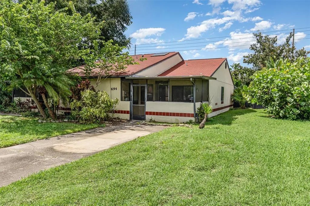 Welcome to 694 Golden Sunshine Circle — a beautifully updated 2-bedroom, 2-bath half-duplex in the quiet Florida Villas community. Offering 1,023 sq. ft. of living space on a 5,439 sq. ft. lot, this single-story home delivers both comfort and convenience just minutes from Space Coast employers, area beaches, and Orlando. Built in 1986 (effective year 1996), the home features a 2019 architectural shingle roof, stucco and wood-frame construction, and a slab foundation for lasting durability. Inside, you’ll find refreshed finishes including new ceiling fans, updated lighting, and a renovated kitchen with newer appliances. A dedicated home office adds flexibility for remote work, creative pursuits, or study. The HVAC system with UV air sanitation enhances indoor air quality, while additional highlights include ceramic tile and carpet flooring, an inside utility room, enclosed porch, storage shed, and an irrigated backyard with patio space for outdoor living. With a low HOA, central location, and easy access to Cape Canaveral, UCF, and downtown Orlando, this property is ideal for first-time buyers, downsizers, or investors seeking a smart and move-in ready opportunity.