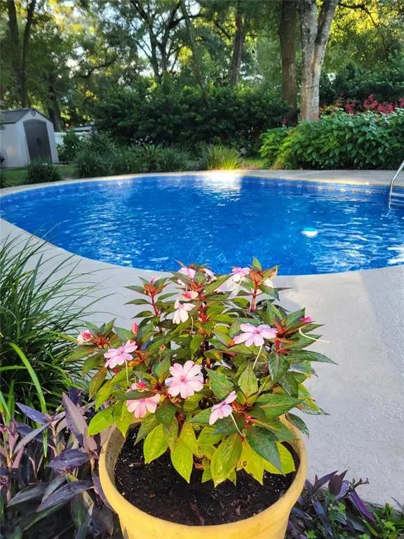 Under contract-accepting backup offers. Are you looking for a pool home close to town? This 3-bedroom, 2-bathroom house is located in northeast Ocala only a mile from Publix and several dining establishments. You will love the spacious living room with cathedral ceiling and a beautiful stone fireplace. The large kitchen has been updated to include a granite peninsula and countertops, stainless steel appliances, tile backsplash, and water-resistant laminate flooring. The master bedroom features a walk-in closet and en-suite bathroom with double sinks, a garden tub, and tile shower. You will have plenty of closet space as there are seven closets throughout the house to store your belongings. An attached one and a half car garage includes a mud room with a new laundry tub and flooring plus added storage space. You will be happy to use the convenient laundry room that sits close to the main bedroom. All flooring in the house is easy to clean laminate with tile in the bathrooms. All the bedrooms, living room, and dining room have ceiling fans with lights. As you head out to the pool, enjoy having a screened in lanai to host that barbecue or pool party. The large backyard is over a third of an acre and completely fenced with a five-foot chain-link fence perfect for your pets. The 13,000 gallon in-ground oval shaped pool is approximately 17 x 27 ft. The concrete deck was resurfaced last summer and includes an area for your patio set. The pool pump was replaced this summer and a new liner was just installed. The roof was last replaced in 2015 and the heat pump/ac unit in 2019. The back yard also has a lemon tree, and there is a fire pit for you to enjoy making some smores or hot dogs. We just added a new 8 x10 shed to the backyard for more storage. Don't miss the pollinator plants which attract the hummingbirds and butterflies. If you are looking for a comfortable home located minutes from town, you need to take a look at this home.