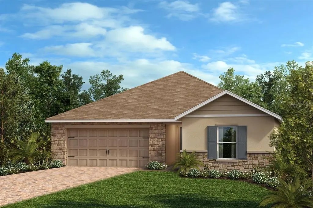 This stunning single-story home features a charming stone exterior and a thoughtfully designed open floor plan. Step inside to find elegant tile flooring and a spacious great room enhanced by soaring volume ceilings. The contemporary kitchen offers a central island, 36-inch upper cabinets, granite countertops, a Moen® stainless steel faucet, a Kohler® stainless steel sink, and sleek Whirlpool® stainless steel appliances. Unwind in the primary suite, which offers a walk-in closet and connecting bath that includes a linen closet, dual-sink vanity and walk-in shower with tile surround. A dedicated laundry room with direct access to the garage enhances everyday ease. A covered back patio completes the home, providing the perfect space to relax and enjoy the outdoors.