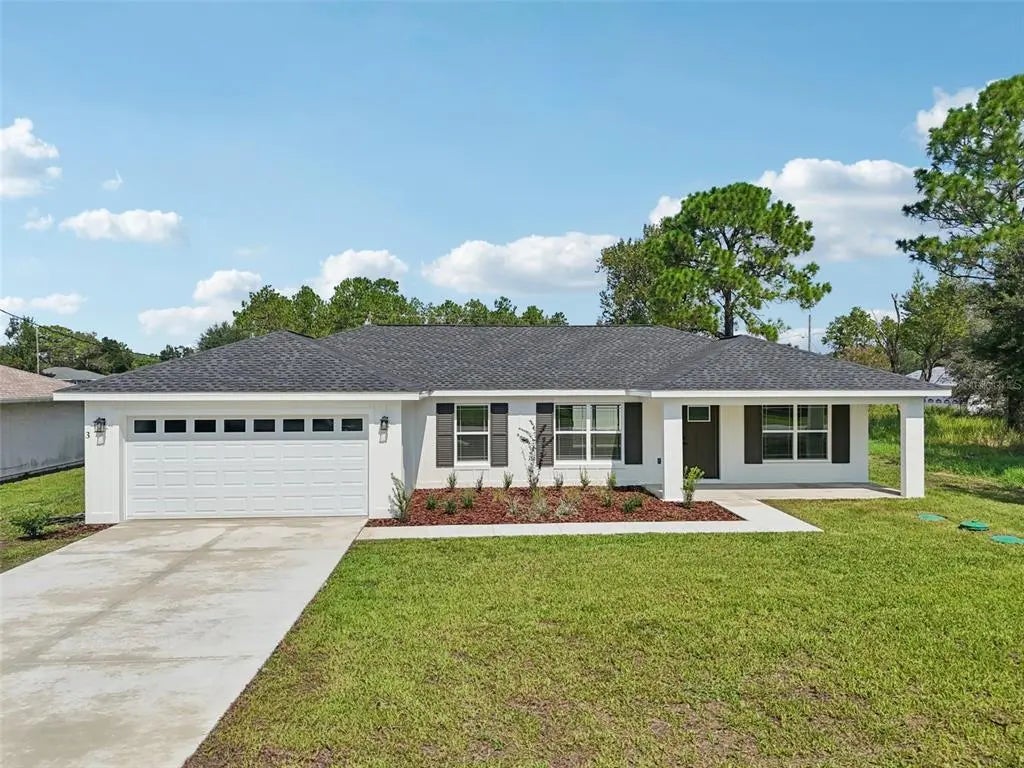 Fully Fenced New Construction Home with $5,000 Credit! Welcome to your brand-new home in beautiful Ocala! This stunning new build offers a fantastic $5,000 credit from the seller, which you can use for closing costs or to buy down your interest rate. The property also features a fully fenced backyard, providing immediate privacy and a safe space for pets or gatherings. This home is stylish and functional with a desirable open-concept and split-bedroom floor plan which includes 4 bedrooms, 2 bathrooms, and a 2-car garage. The kitchen is a true centerpiece, featuring sleek 42-inch upper cabinets and elegant quartz countertops—a modern alternative to granite. The space flows seamlessly into the main living area, where a magnificent 9-foot, 3-panel glass slider opens to a private rear patio, perfect for indoor-outdoor living. The primary suite is a private retreat with a luxurious en-suite bathroom that includes a beautiful frameless glass shower. The home's curb appeal is enhanced by a striking board and batten stucco exterior and a modern windowed garage door. With 1,487 sq ft of living space, this home also includes a 157 sq ft oversized front porch and a 145 sq ft rear patio, giving you plenty of room to relax and enjoy the Florida weather. This home won't last long, so don't miss your chance to see it!