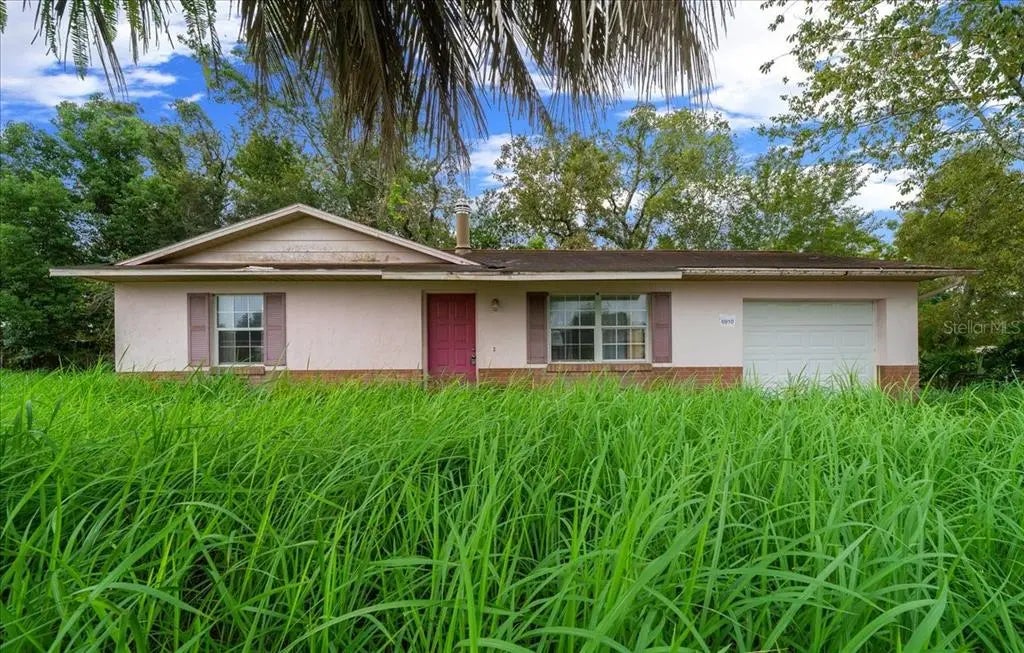 Under contract-accepting backup offers. There is no power. Investor special. This two-bedroom, one-bath single-family home is located on a paved, publicly maintained road in the Florida Heights subdivision, conveniently near Ocala and The Villages. Built in 1983, the home offers 840 heated square feet on a cleared 0.23-acre lot. Constructed with concrete block and finished in brick and stucco, it sits on a slab foundation and features a shingle roof. Zoned R1 within a single-family residential neighborhood, the property is not in a flood plain and has no HOA fees or age restrictions. Utilities include public water and a septic tank, with electricity available but currently disconnected. Interior features include a living room and dining room combo, a freestanding wood-burning fireplace, carpet and linoleum flooring, and dual closets in both bedrooms. The home also includes a one-car attached garage with assigned parking. Offered as-is and priced to reflect its current condition, the property requires extensive renovations and improvements throughout. It presents an excellent opportunity for investors or buyers seeking a value-add project with strong equity potential. This could become a great rental income property. Schedule a showing or consultation to explore the possibilities.