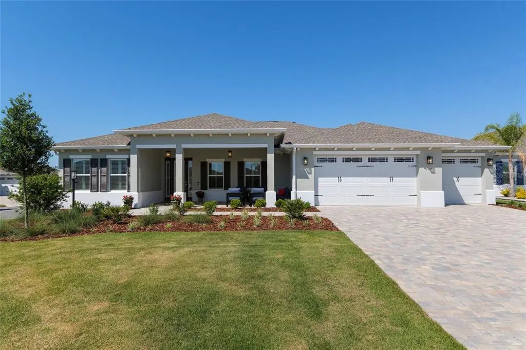Gorgeous ALMOST NEW 2024 home in Candler Hills in On Top of the World's 55+ gated golf course community! SO MANY UPGRADES ~ BETTER THAN NEW with over $150k in upgrades during construction and after purchase (see attached list)! Great curb appeal with beautiful landscaping, paver driveway and front porch! OVERSIZED .37 acre CORNER lot on a cul-de-sac street! SPACIOUS home with 2309 ft ~ two bedrooms, two bathrooms PLUS office/flex room, Florida room, and HUGE 3 CAR GARAGE! This EXPANDED Brighton has plenty of natural light in an OPEN FLOOR PLAN with luxury vinyl plank flooring and plantation shutters throughout. AMAZING kitchen features quartz counters, island/breakfast bar, composite sink, backsplash, SS appliances including gas cooktop with vent hood, built-in oven/microwave, and pantry. Florida room has remote controlled blinds. Office/flex room has French doors. Primary suite has tray ceiling, large walk-in closet with custom shelving, and en suite with dual sinks, walk-in tiled shower with bench seat, linen closet, and water closet. Laundry room includes sink and extra storage. Water filtration/softener and gutters included. Great outdoor space with large screened lanai, fire pit, and patio. Enjoy OTOW's resort style living with golf courses, pools, fitness centers, pickleball courts, tennis courts, walking/biking paths, dog parks, large private R/C flying field, softball field, clubs, and much more! Convenient location to shopping, dining, medical, parks, entertainment and the World Equestrian Center, along with golf cart access to two shopping centers.