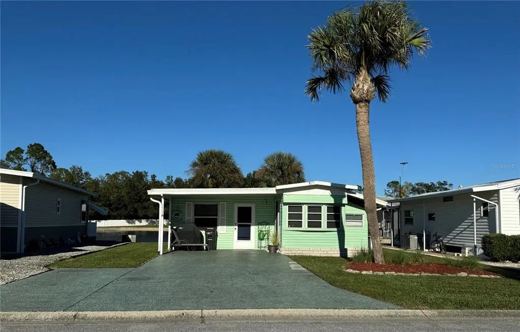 YOU WON’T FIND A WATERFRONT PROPERTY LIKE THIS! The home sits on a wonderful large pond and shows beautifully. AND THE OWNERS HAVE DROPPED THE PRICE $5,000.00! There is a lovely pond view looking outside the back sliding doors. It is perfect for full-time affordable living and cost-effective for snow birds. No rent as you own the land. Low monthly fee of $130 which maintains the common elements and amenities for your use. American Condominium Park is a 55+ gated community with heated pool, clubhouse, exercise room, sauna, hot tub, tennis court, horse shoe pits, shuffle board, and many more amenities. A friendly active community with dances, dinners, and entertainment where you can meet your neighbors. The large backyard propane tank for the stove in kitchen was recently filled. The Weber Grill has its own small tank which was also recently filled. Both tanks will be staying with the property. Central A/C and heating unit has a newly installed UV light. The front door opens into a large oversized, carpeted living room. From the living room there are new steps with grab bars on both inside doorways and one new door installed, that leads into the master bedroom. The master bedroom is spacious and has ample closet space. In 2023 most of the A/C ductwork was replaced. 220-volt electric outlet was added in the second bathroom for future upgrades. Currently there is a combination washer/dryer in the bathroom. Large wall mounted TV and DVD player will be staying, and the TV antenna installed on the roof gets over 80 over the air channels. There is also a Fire TV Stick for the TV which will be staying. The living room couch has a pull-out bed for guests. In addition, the living room has a standalone fireplace/heater. The kitchen island is on wheels and has storage space with drawers and spice rack. New curtains and rods in living room, bedroom and kitchen. Relax outside and enjoy the large pond and what nature has to give on your 13'x11' rear patio and your seawall.