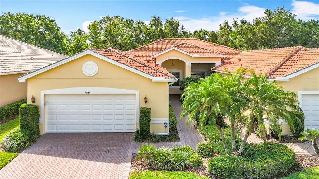 This villa was designed by GL Homes Builder as part of the very popular Regal Villa Collection Series at Valencia Lakes, one of the most desirable 55+ gated communities in the greater Tampa area. This one-of-a-kind 3 bedroom, 2 baths and oversized 2 car garage Victoria model is freshly painted with Benjamin Moore ‘agreeable grey’ paint, plus a brand-new high-quality carpet was just installed in two bedrooms. It is a showpiece at a great price, and it is move-in ready! (The property is vacant, and the closing date could be flexible to accommodate a prospective buyer.) A generous sized front patio creates an additional private outdoor space to relax/entertain on lovely Florida days. As you walk through the front 8 ft. tall entry glass door, you will notice an open split bedroom floor plan with lots of natural light and 9 ft. tall ceilings. High quality distinctive crown molding complements the design of this home adding to its value. Ceramic tiles in the main areas are installed in all main areas. The large gourmet kitchen has a raised countertop that is extended to a serving bar. Natural stone tiles with a lovely mosaic design are installed under the raised countertop. 42" top quality white cabinets feature a custom-built cabinet pantry. There is a breakfast area in the kitchen for casual dining. GE appliances and a built-in reverse osmosis filtration faucet complement the kitchen area. The spacious living room has an 8 ft. triple sliding door leading to the private screened lanai which overlooks a lush, mature nature preservation area providing your own personal lush Florida landscape. Enjoy your favorite beverage while watching blooming trees, birds and wildlife in a stress-free environment right in the comfort of your own home! With a split floor plan, the primary bedroom is located in the back of the house and features a view of nature preservation. It also includes 2 walk-in closets, ensuite bath with an oversized walk-in shower and a double vanity. There is a washer and dryer in the large laundry room, as well as a utility sink and additional shelving for storage. There are ceiling fans installed in every room including the lanai. HVAC and other appliances have been professionally serviced on a regular basis. ADT monitored alarm system, Internet and Cable are INCLUDED in the HOA fees along with other important features. Valencia Lakes is a 55 and better active adult golf cart community. 40-acre waterfront outdoor recreation area with resort-style heated pool, lap and resistance pool, 40,000 sq. ft. clubhouse, deluxe Bistro is to come very soon, arts and crafts studio, har-tru tennis courts, fitness center, half-court basketball, pickleball and bocce courts, dog park, baseball park, community garden, hundreds of clubs and activities, RV/boat storage area. Over 100 acres set aside as nature preserves; enjoy the quiet and solitude of peaceful views, birds & wildlife by the water. More than 3 miles of bike and walking paths. Great sense of community with great friendly neighbors. Please call for a private showing and experience this wonderful community for yourself. Tampa, St. Pete and Sarasota 30-45 minutes away. Close to the airport, medical facilities, shopping and golf.
