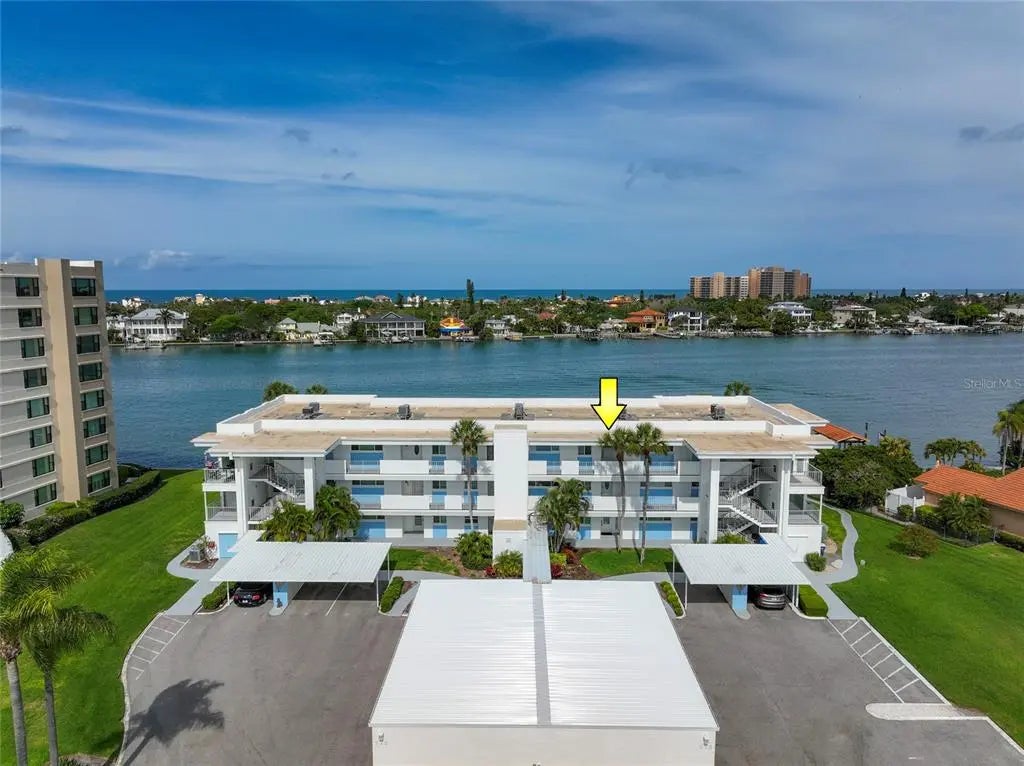Washer and Dryer in unit! HIGH AND DRY! Light and bright, this STUNNING top-floor unit holds the best views in the building! You'll find 180 degrees of intracoastal waterway views as soon as you walk into this home. A large Florida Room sits off the Living Room, with a built-in dry bar. This space is perfect for ending the day with a sunset and a glass of wine. The Master Bedroom shares the same stunning views, also with its own access to the Florida Room space. Each closet has beautiful built-ins, and every surface is updated! This building is well-cared for, with fresh paint in 2022, a 2018 Roof, and 2022 Building Elevators. Easy living is ensured with the new water heater, A/C 2015, updated windows 2016. Assigned parking with a covered parking space and storage unit! Don't miss out on this exceptional unit! Pet restrictions to be voted on in May, and it is very possible that pets will be allowed. Service pets are already allowed.