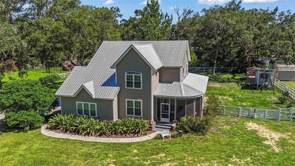 PRICE REDUCTION!!!Modern farmhouse-style home on 1.15 fully fenced acres in the rapidly growing Zephyrhills area. This property is move-in ready with extensive upgrades including new AC units with UV filters (2024), durable metal roof (2021), New South windows (2022), new water heater (2023), and new French doors at the front entry and lanai (2025). Best of all, there’s no HOA, no CDD, and no flood insurance required. Inside, the remodeled kitchen showcases granite countertops, a spacious sit-in island, and a seamless flow into the open-concept family room with bright recessed lighting. A formal dining room, separate laundry room, and plantation shutters throughout add warmth and functionality. The upstairs primary suite is a private retreat featuring a soaking tub, stand-up shower, vintage-style dual vanity, and quartz countertops. Two additional bedrooms share an updated full bathroom with quartz countertops. The dedicated office provides flexible space for work or study. Step outside to the expansive screened-in lanai with panoramic views of the property—ideal for relaxing, entertaining, or enjoying peaceful Florida living. This modern farmhouse offers the perfect balance of space, style, and freedom, with country charm just minutes from all that Tampa Bay has to offer.