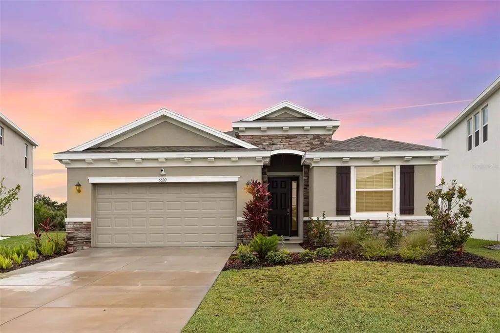 Welcome to 5620 Night Owl Terrace, a beautifully designed single-story home nestled in the desirable Silverstone North community of Palmetto, Florida. Built in 2022 by D.R. Horton, this residence offers 4 bedrooms, 2.5 bathrooms, and 2,045 square feet of thoughtfully planned living space. The home's open-concept layout features a spacious kitchen equipped with stainless steel appliances, including a dishwasher, range, and microwave. The kitchen seamlessly flows into the large living and dining areas, creating an ideal space for entertaining or relaxing with family. Sliding doors lead to a covered lanai with a beautiful lake view, perfect for enjoying Florida's outdoor lifestyle. The primary suite is situated at the back of the home, offering privacy and tranquility. It includes two walk-in closet and an en-suite bathroom with stone countertops. At the front of the home, two additional bedrooms share a full bathroom, while a fourth bedroom can serve as a guest room or optional den. A convenient powder bath and laundry room off the garage complete the interior. Community amenities enhance the living experience, featuring a playground and pool. Located near I-75, residents have easy access to local schools, shopping, dining, and the beautiful Gulf Coast beaches