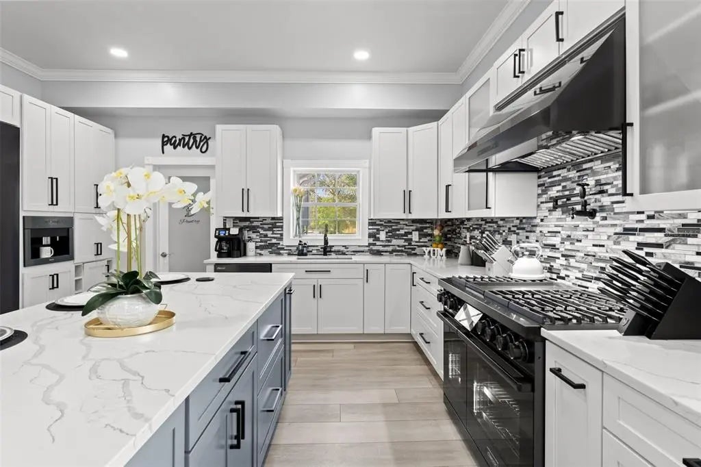 Upon entering, you are greeted by a majestic two-story foyer illuminated by a stunning chandelier and highlighted by a custom quartz staircase with modern cable railing. To the right, a formal sitting room invites relaxation, while an adjacent dining room, crowned by an elegant chandelier, is perfect for gatherings. The chef’s kitchen is a culinary masterpiece, equipped with high-end Dacor double ovens, a 48-inch Dual-Fuel Steam Range with an embedded griddle and six-burner gas cooktop, a double-column refrigerator, a built-in double freezer in the kitchen island, Dacor dishwasher, and a Miele espresso maker. The spacious quartz-topped island functions as a workspace and dining area. This kitchen also includes a built-in ice maker, a walk-in pantry, and a butler’s pantry. The eat-in nook framed by a bay window offers views of the pool, complemented by an additional formal dining area for larger gatherings.