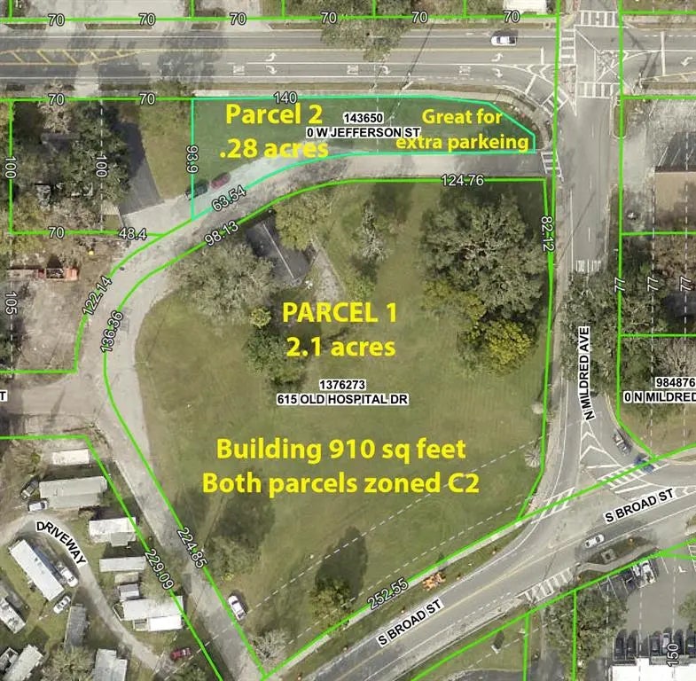 Under contract-accepting backup offers. !!! PRIME LOCATION in the City of Brooksville !!! Roads on 4 sides for INCREDIBLE VISIBILITY and EASY EASY EASY ACCESS...over 750 ft of road frontage!!! ZONED C2!!! GREAT LOCATION for a gas station, convenience store, church, or any business looking!! Road Frontage on Broad Street (US 41), Jefferson, Mildred, and Old Hospital Road!! There is a stop light at Jefferson and Mildred! Annual Average Daily Traffic: 33,700 combined (US 41/Broad Street is 11,600, Jefferson is 11,100, Mildred is 11,000). Mostly cleared already and NO flood (X zone). SITE HAS CONNECTION TO PUBLIS SEWER AND WATER!! Sale includes 2 parcels:the large parcel is Parcel Key: 01376273 and is 2.1 acres. The smaller parcel giving you room for extra parking is Parcel Key: 00143650 and is .29 acres. Totaling 2.37 acres. The building is located on the larger parcel as is 910 sq feet of office space (or any C2 use); 1196 total. 2 bathrooms. The property is priced to sell at the property appraiser's market value.
