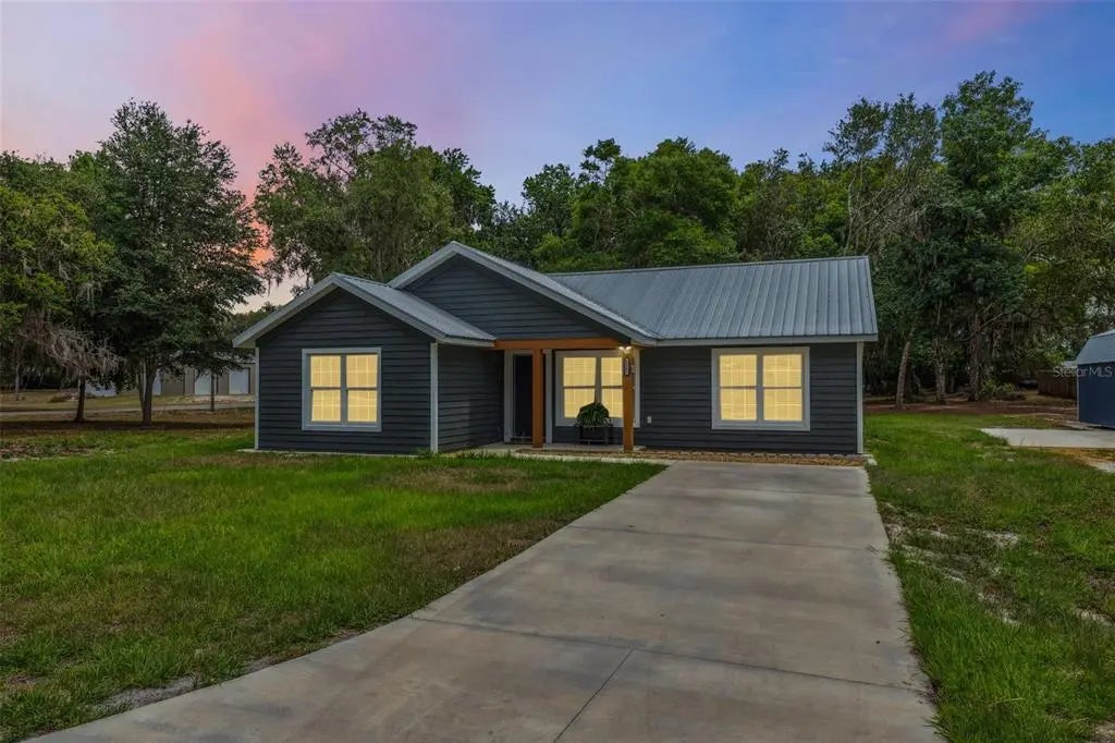 Built in 2023, this charming and thoughtfully designed home offers a blend of modern comfort and relaxed rural living just blocks from the tranquil waters of Lake Panasoffkee. Featuring three bedrooms and two bathrooms, the home welcomes you with a covered front porch ideal for enjoying the quiet outdoors. Inside, an open floor plan showcases vaulted cathedral ceilings in the living room, creating a spacious and airy feel, while the kitchen includes an eat-in dining area, a breakfast bar, and flows seamlessly into the main living space. The primary suite includes a walk-in closet and a private ensuite bathroom with dual sinks for added convenience. A dedicated laundry room adds functionality, and a rear open patio offers a private spot to unwind, with a backyard shaded by mature trees that provide natural privacy. A side parking pad offers additional convenience, while a barn-style shed is perfect for extra storage or for housing a riding mower. Just 1 mile from Lake Panasoffkee, residents can enjoy boating, fishing, and scenic views year-round. The home is approximately 7 miles from the I-75 on-ramp—making travel to Tampa and surrounding areas easy for commuters. Nearby attractions include Dade Battlefield Historic State Park (12 miles), offering wooded walking trails and historic reenactments, and Lake Okahumpka Park (15 miles), known for its peaceful fishing spots, boardwalks, and picnic areas. The property's location balances nature and accessibility, offering a serene lifestyle with modern convenience.